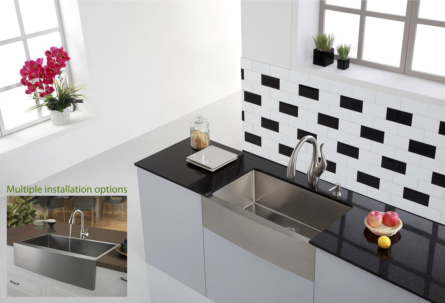 Perhaps the biggest thing that sets the Zuhne Prato apart from other farmhouse sink styles is that this one sink can be mounted in three different ways. Most other farmhouse sinks may only have one mounting option, so you have to know well in advance how you want your farmhouse sink mounted before you ever buy it. With the Zuhne Prato, you can buy the sink first and worry about mounting later. Choose between a 3/8-inch positive reveal, a zero reveal (flush) mount, or a 1/8-inch negative reveal. The great thing about the multiple mounting options is that it also frees you up stylistically if you want to keep your sink but change your countertops at a later date.
